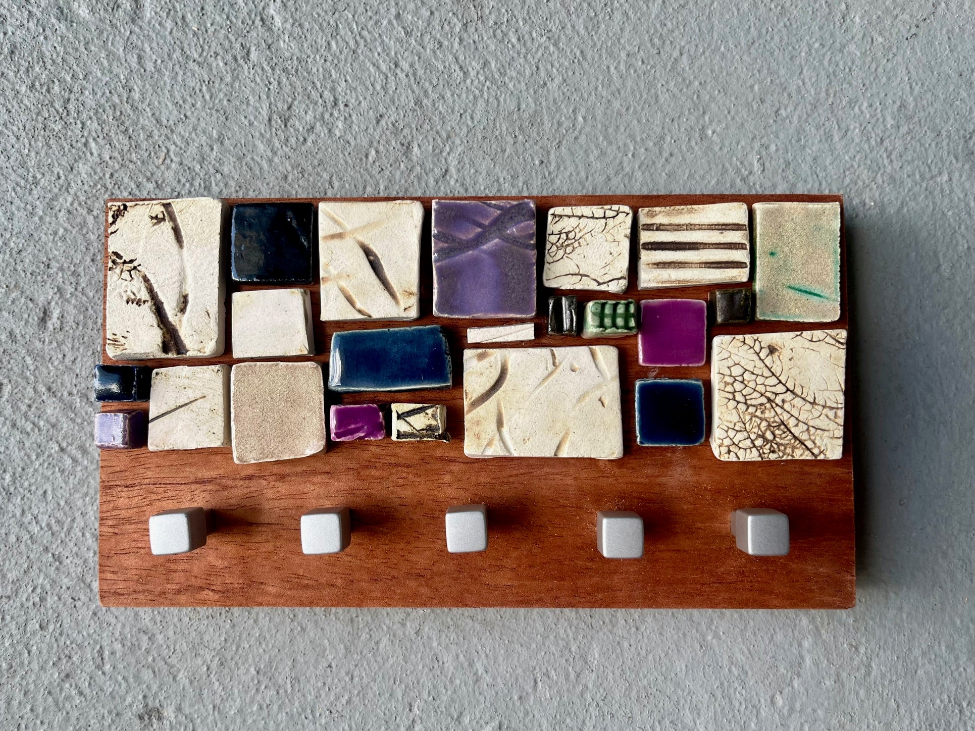No more lost keys. Declutter your space using our one of a kind and best seller key holder. Mounted on solid wood, we use the best quality hooks to make this piece durable. Decorated with a variety of mini hand made tiles that give each key holder a one of a kind look. Choose from 3-5 hooks.
